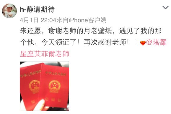 老师前天收到一个令人开心的喜讯,特别转出来和你分享!很高兴这位粉丝受到月老公公的庇佑,已和另一半幸福领证,大家赶快来沾沾桃花与喜气,为自己加持好运!在老师的官方微信a529597输入【月老图】,可下载人人称奇的灵图!