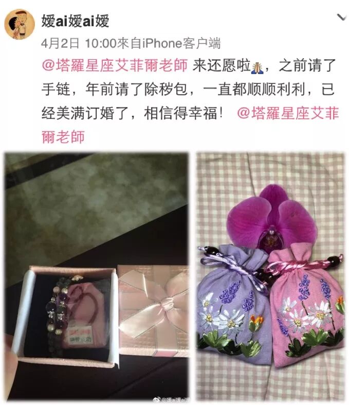 老师前几天收到一个令人开心的好消息,特别转出来和你分享!很高兴这位艾粉佩戴了手炼丶除秽包,生活一切顺利丶并已和另一半幸福订婚,老师会帮她到庙里还愿!请你一起来沾沾桃花喜气,相信下一个步入婚姻殿堂的就是你!