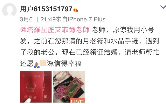 老师前天收到一个令人开心的喜讯,特别转出来与你分享!很高兴这位艾粉受到月老公公的庇佑,已和老公幸福领证,请你一起来沾沾她的桃花喜气,为自己加持好运!在老师的官方微信a529597输入【月老图】,可下载人人称奇的灵图!