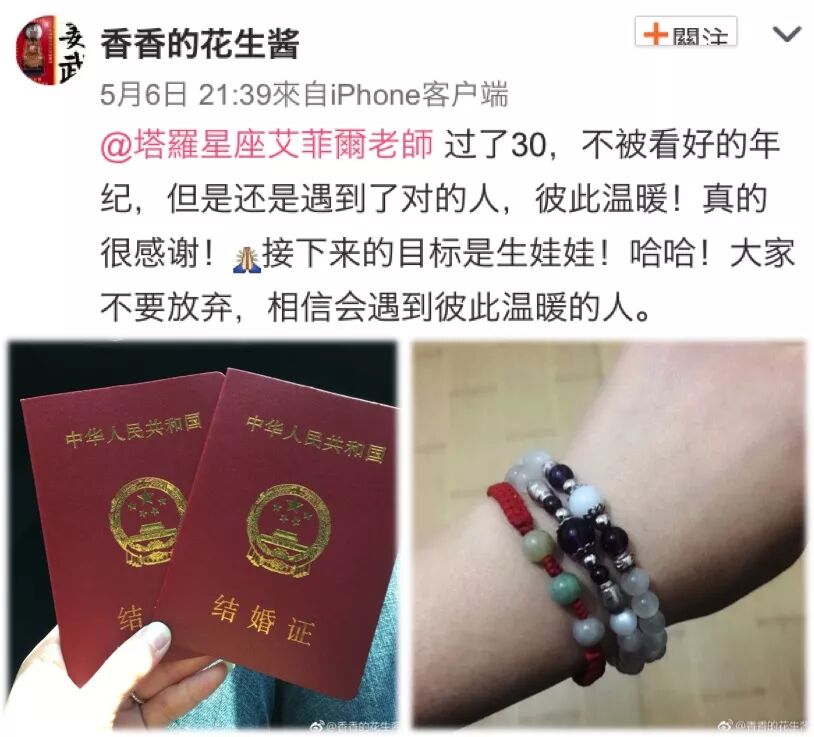 这是老师今天收到最开心的喜讯,特别转出来和你分享!这位粉丝佩戴了老师用五行八字推荐的「姻缘手炼」後,遇到真爱,现在已经和老公幸福领证!老师会抽空到庙里帮她还愿!希望看过这个幸福见证的你,也能找到真爱丶心想事成!