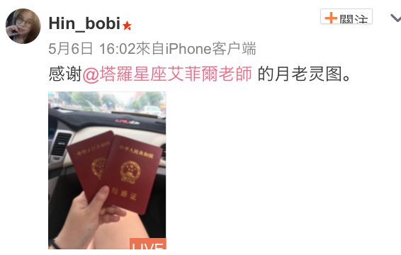 老师前几天收到一则令人开心的喜讯,特别转出来与你分享!很高兴这位粉丝受到月老公公的庇佑,已和另一半幸福领证!大家赶快一起来沾沾她的桃花喜气,为自己加持好运!在老师的官方微信a529597输入【月老图】,可下载人人称奇的灵图!