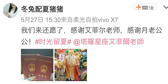 老师前几天收到一个令人开心的喜讯,特别转出来和你分享!月老公公可是很灵验的!很高兴这位艾粉受到月老公公的庇佑,已和另一半幸福领证,大家赶快来沾沾桃花与喜气,为自己加持好运!在老师的官方微信a529597输入【月老图】,可下载人人称奇的灵图!