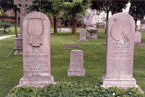 拜伦、雪莱、济慈,这三位英国浪漫主义诗人,处于同时代而都不幸英年早逝。拜伦的墓志铭摘自他的诗作《恰尔德·哈洛尔德游记》,雪莱的墓志铭出自莎士比亚的诗句。济慈的墓志铭英文为Hereliesonewhosenamewasw