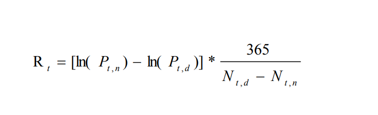 假设 Pt,n 是 t 时刻近月合约的价格,Pt,d 是 t 时刻远月合约的价格,Nt,n 是近月合约在 t 时刻距离交割日的天数,Nt,n 是远月合约在 t 时刻距离交割日的天数。则展期收益率 Rt为: