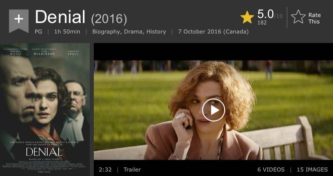 《否认》由米克·杰克逊执导,改编自黛博拉·利普斯塔特的自传小说,讲述作者因称右翼英国作家大卫·艾文为“犹太大屠杀否认者”,而遭对方控诉的法庭交战。