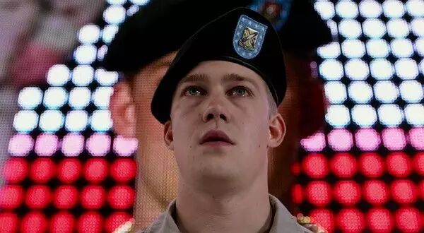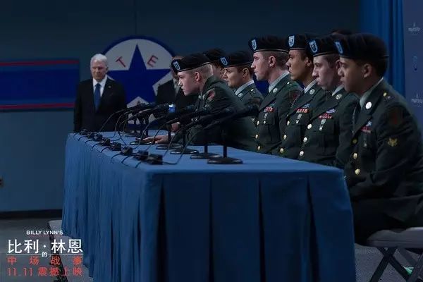 当人物进行对话时,影片又使用了大量的特写镜头,进行正反打的切换,仿佛每个人都在对着观众说话。影片效果清晰到,每个人绿色的眼眸里,高光点都可以数清楚。让那些质疑和讽刺,句句都说到了观众心里。而透过比利·林恩的眼睛,我们时而看到的是一个19岁德州大男孩儿的迷茫,时而看到的是一个敢于和娱乐文化说不,有着自己的底线,正视自己职业的军人。