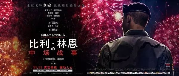 国内的电影名称翻译,一直走的都是全知路线,就是一个名字要概括出影片的类型和内容,让观众一看名字就知道电影是关于什么的,从而可以简明的理解,更容易做选择。该片在拍摄期间,按照英文名称《Billy Lynn's Long Halftime Walk》翻出来的暂定名字为《比利·林恩漫长的中场休息》。其实这个直译的片名更加自然一些,主要传递了“漫长”的内心感受,令人们对这个未知的“漫长”充满了好奇,也更符合李安本人与这部新片的调性。不过为了影片在国内可以顺利卖座,《比利·林恩的中场战事》作为更加直白的电影命名,并没有什么问题。只是略微有些把李安精心烹制的一锅高汤,变成了一道硬菜的感觉。