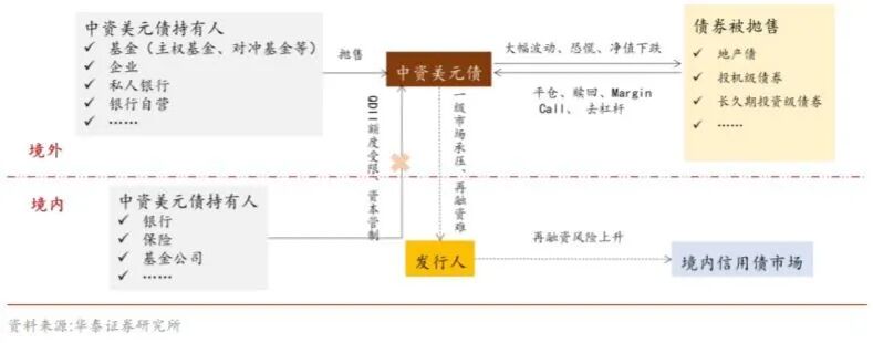 第三阶段:3月第2周至今,风险资产剧烈调整,基金赎回压力导致各类资产被抛售以补充流动性,中资美元债也在其中。进一步,投资者之间的挤兑带来了杠杆踩踏,加深市场的跌幅。市场呈结构性下跌的特征,参与方越广、投资者杠杆越高的板块此轮受冲击越大。中资美元债中,地产债跌幅最大,而城投债则较为稳定,流动性冲击引起的连锁反应如图所示。
