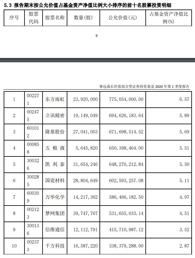 4月20日,备受关注的睿远成长价值混合基金披露了一季报,该基金一季度末股票仓位为89.99%,相较于上个季度末的91.05%略有下降,但仍保持高仓位。一季末前五大重仓股为东方雨虹、立讯精密、隆基股份、五粮液、凯利泰、相比去年三、四季度末的持仓整体变化不大。连续三个季度保持东方雨虹为第一大重仓股,对立讯精密进行了一定幅度的增持,而梦网集团、信维通信首次进入前十大重仓股个股名单。
