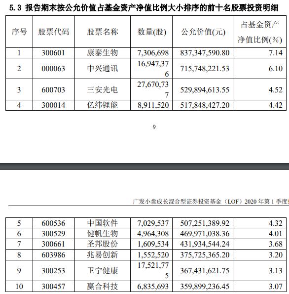 而由刘格菘管理的广发小盘成长混合基金则减仓,一季度末仓位为81.45%,较去年底的92.2%下滑了10个多百分点。前五大重仓股为康泰生物、中兴通讯、三安光电、亿纬锂能、中国软件。刘格菘在广发小盘成长写道,2020 年一季度,A 股市场受新冠疫情和海外市场震荡影响,波动幅度较大,基金主要配置了科技成长、医药生物、新能源等行业及部分优质消费公司,对医疗服务行业的配置有所增加。