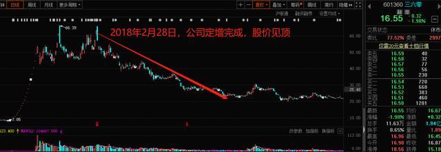 2018年2月28日,在借壳上市仅仅3个月之后,三六零就增发了63.6亿股,募集超过500亿资金。高位定增,这无疑是把股市当成了提款机。而在定增之后,三六零的股价就此见顶,并开始漫漫"熊途"。