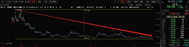 除了业绩大降之外,其股价表现更是惨不忍睹。在回归A股连续拉出18个涨停板,创出了66.39元的历史最高价之后,截止到2020年9月30日,三六零的股价仅剩下16.55元,股价已经下跌了75%,市值更是较巅峰期蒸发了超过3000亿。