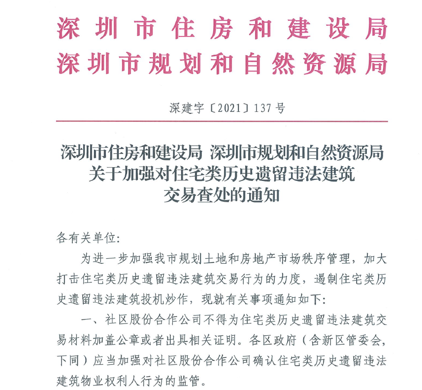 近日,深圳市住建局和深圳市规划自然管理局发布一则《关于加强对住宅类历史遗留违法建筑交易查处的通知》。