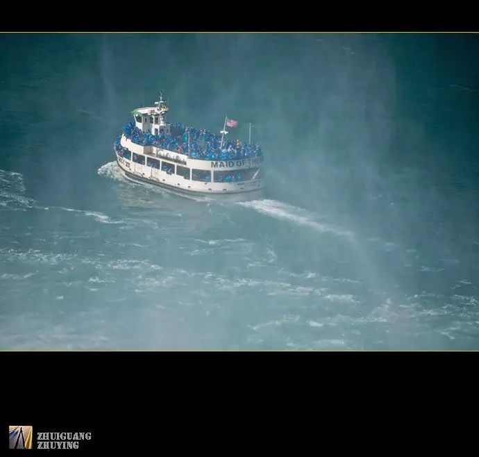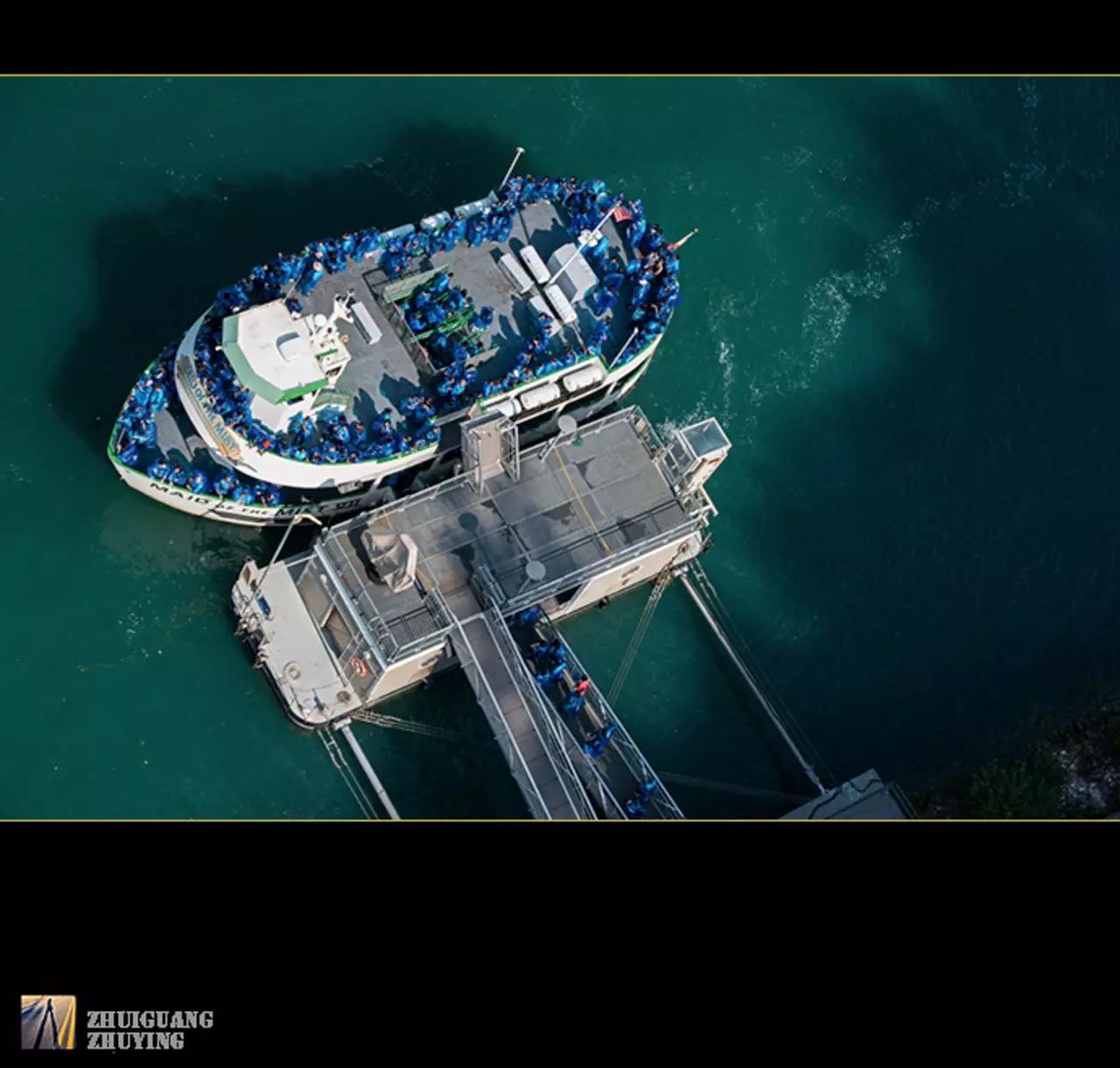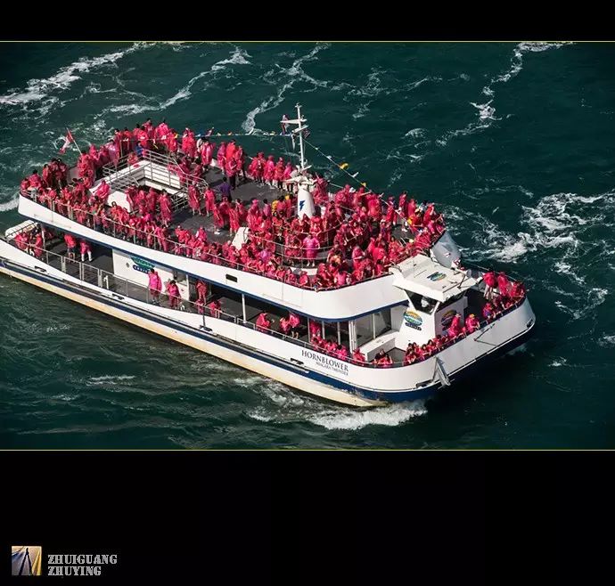 8.这是加拿大的游船。游客全部穿着红色雨衣。