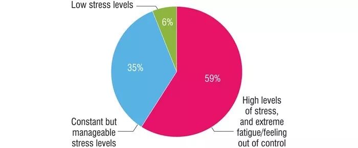 国际劳动者援助计划组织ComPsych在2017年的调查反映,百分之五十九的雇员都受到高度压力的困扰。这些雇员还说,他们感到极度疲劳和失去控。