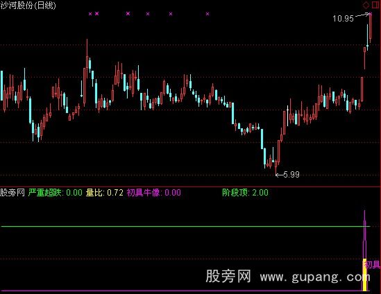 DRAWTEXT(过利,1,'强势牛股'),,COLORMAGENTA ;
