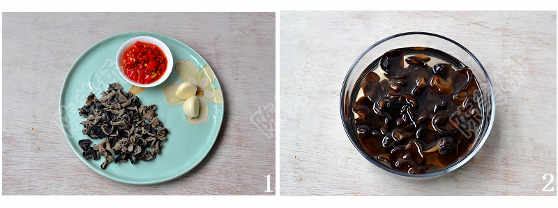 干木耳20克(无根)、剁椒1汤匙、大蒜2粒、酱油1汤匙、米醋1汤匙、