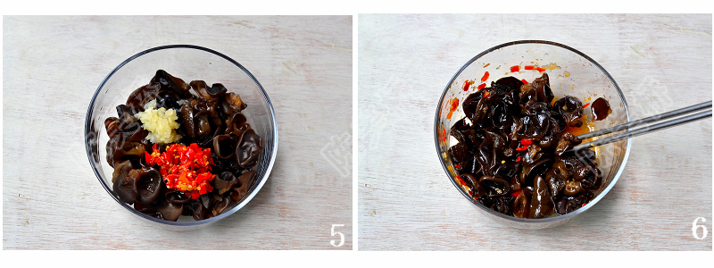 5、木耳入大碗,调入香油、酱油、辣椒油、米醋、蒜泥、花椒油、白糖、剁椒和适量盐。