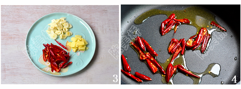 4、炒锅烧热,放花生油,油热后小火炒香干辣椒。