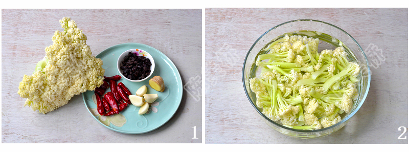 2、花菜冲洗干净后,拆成小朵,放在加了盐的清水里,泡10分钟后沥水。