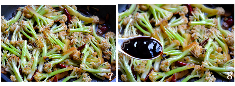 花菜入锅翻匀后,加盖子焖一会儿,有利于花菜均匀熟透。