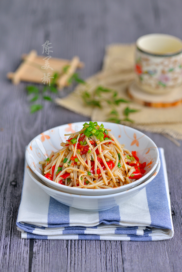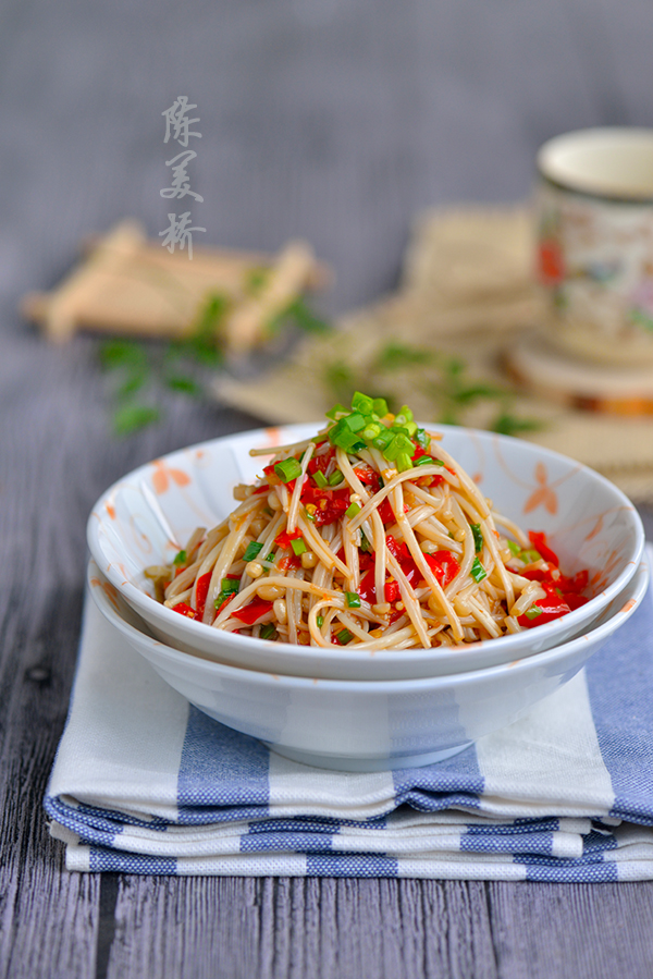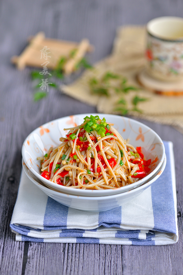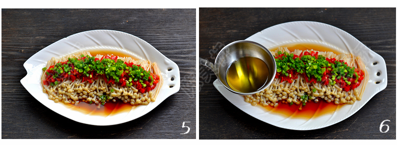 蒸好的金针菇水特别多,要先倒掉,再放调料。淋佐料的油一定要热。