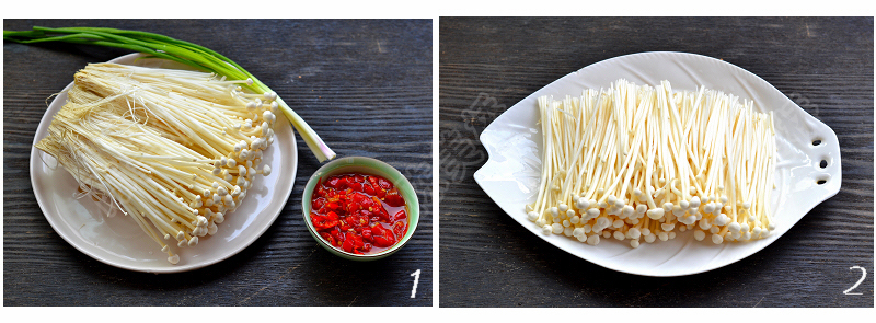 金针菇300克、香葱2根、剁椒2汤匙、蒸鱼豉油2汤匙、花生油2汤匙