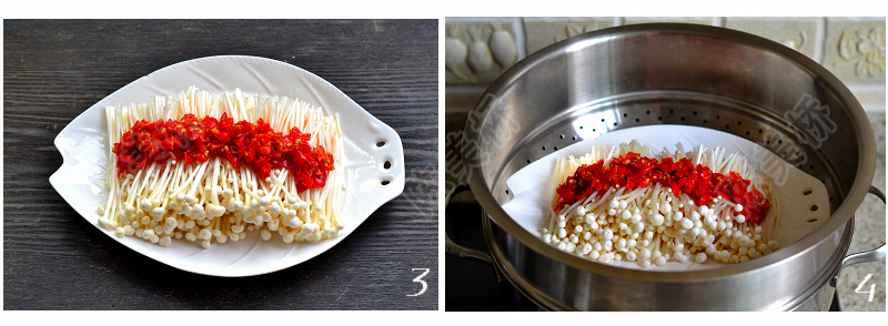 3、金针菇中间均匀铺一层剁辣椒。