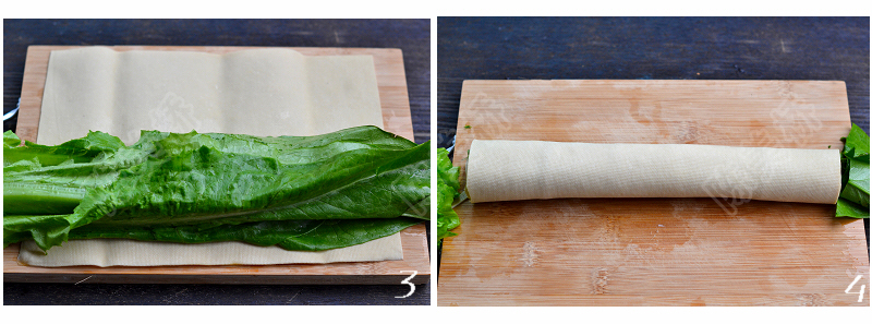 有些地方的千张薄有些地方厚,都可以做,但是一定要卷紧。如果不喜欢吃茎的话,可以将千张分成两份,然后全部裹叶子部分。为了避免一头大一头小,也可以茎那方和叶那方交错放。