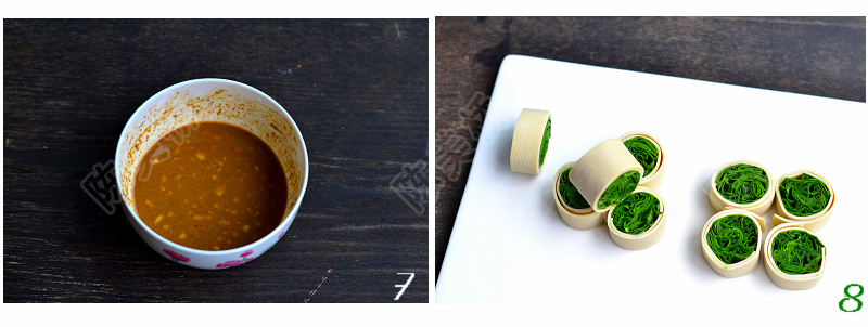 8、将千张卷切成3厘米的小段,收口的地方接触盘底(以免散开),摆盘醮酱或者淋汁而食。