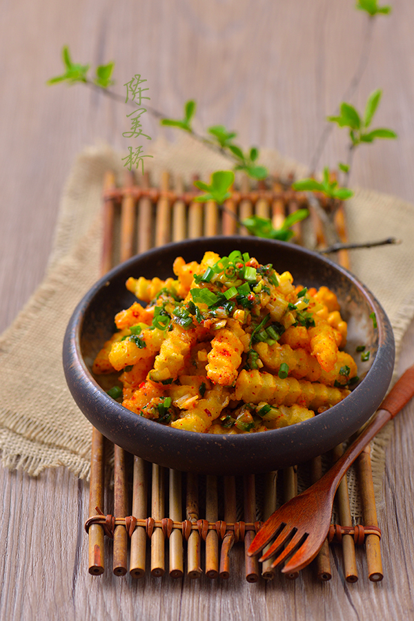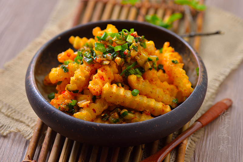 无论春夏秋冬,成都附近的小城里,到了周末或者夜间,街市上就有好些小贩,推着小车卖狼牙土豆。装着大量植物油的锅里常常正在炸着用工具切成的土豆条,翻滚着欢乐的油花,旁边是辣椒粉之类的调料,土豆条炸好后,调味而食。小女生尤其爱吃这种带有层层口感的小零食,我们附近各个学校门口的狼牙土豆特别多。