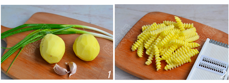 土豆300克(黄心最好)、大蒜2粒、香葱2根、盐适量、干淀粉3汤匙、细辣椒粉1汤匙、
