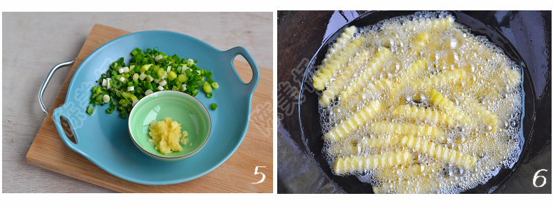 8、炸好的土豆入大碗,调入辣椒粉、孜然粉、花椒粉、蒜泥、葱花、适量盐,滴几滴香油(香油可不放),拌匀。