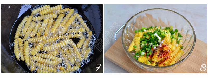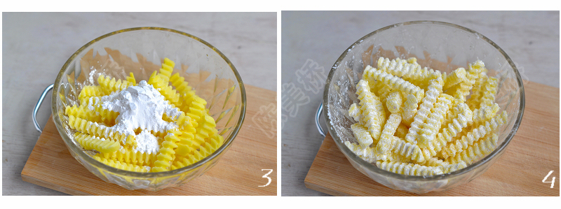 2、土豆条裹一层淀粉再炸,既能防止油份过多渗入土豆,外面还能更酥脆。