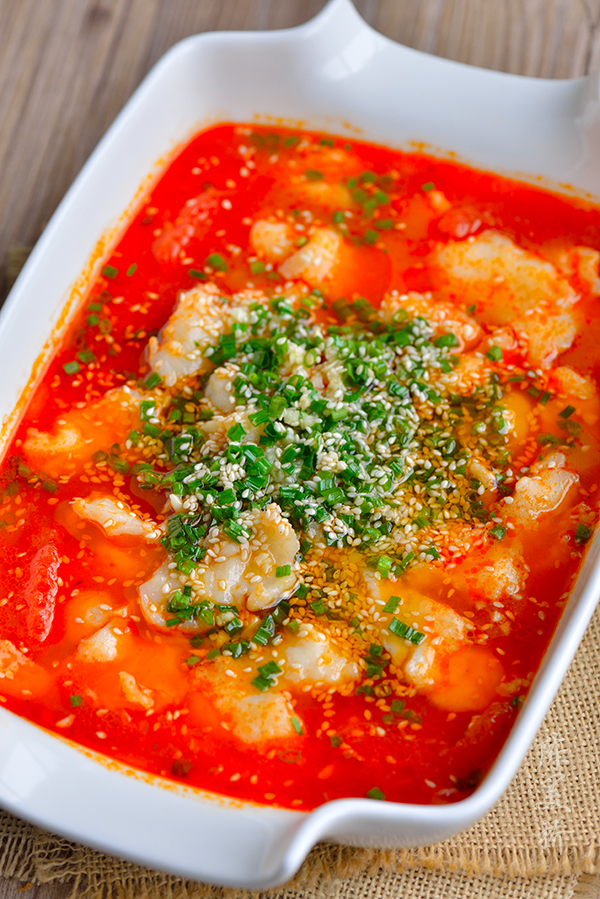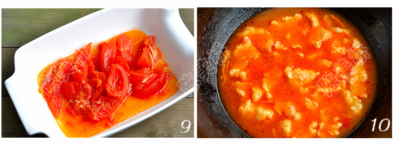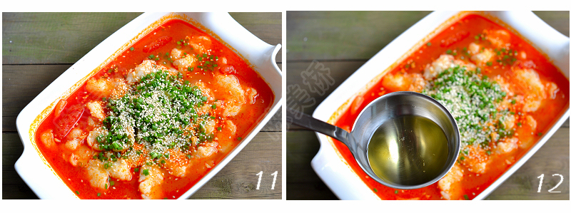 11、鱼片和汤汁全部盛在装番茄的大碗里,上面放剩下的大蒜末、葱花和白芝麻。