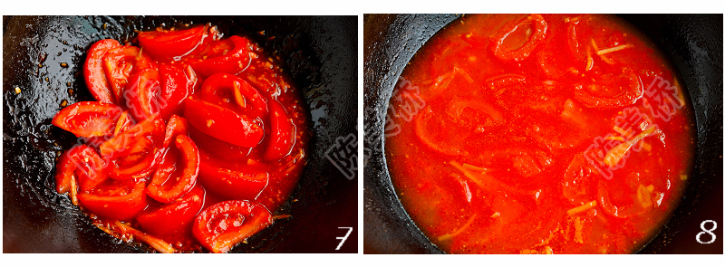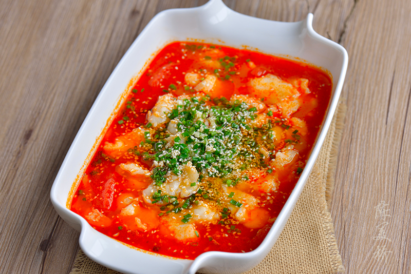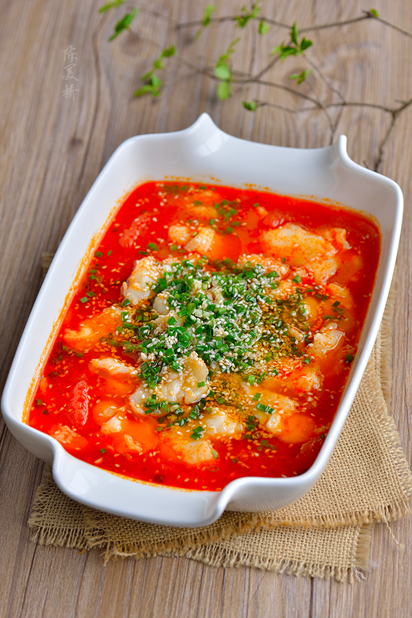 水煮式鱼片,但并不是所谓的麻辣水煮鱼,只是取了水煮这种方式。在老家,有的店家会在番茄鱼里加些野山椒和花椒,味觉冲击强烈,但没几个人敢喝那汤汁。而自家只用炒香的葱姜蒜熬出的番茄汤汁似乎更适合大众口味。