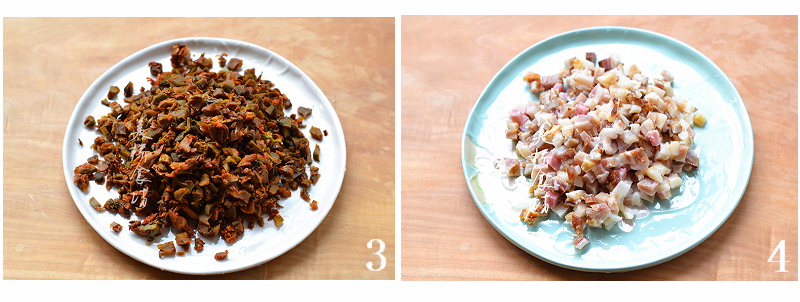 2、腊肉和盐菜都有咸味,不用放盐了。还可以根据喜好,将盐菜和腊肉切细点。