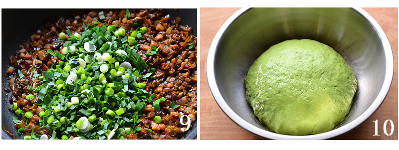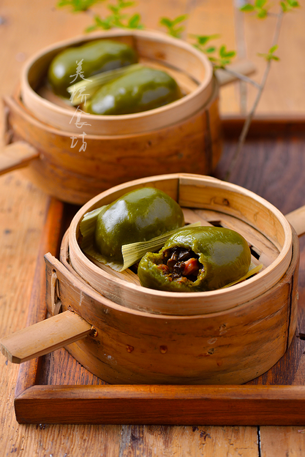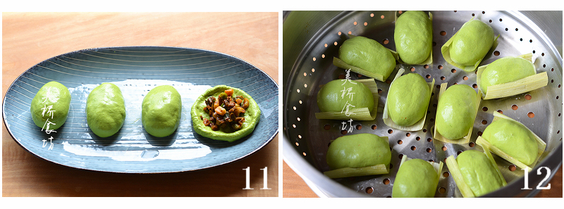 11、以40克为一个小剂子,包入适量的盐菜腊肉馅。
