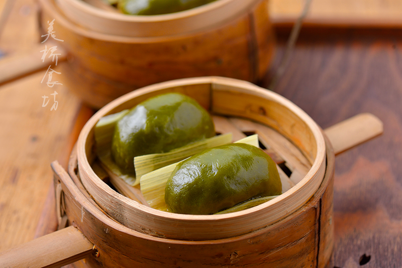 12、在清明粑粑生坯底下,放玉米叶或棕叶。蒸锅将水烧开,放清明菜粑粑大火蒸10到12分钟。趁热食用。