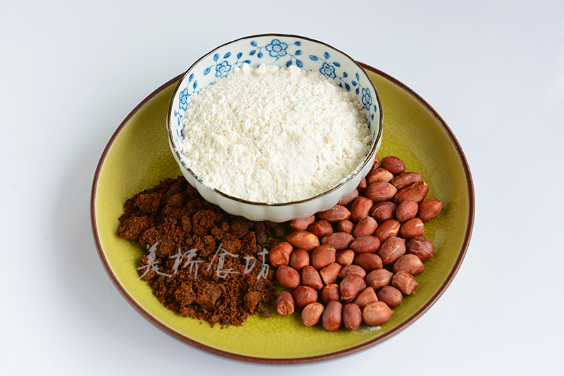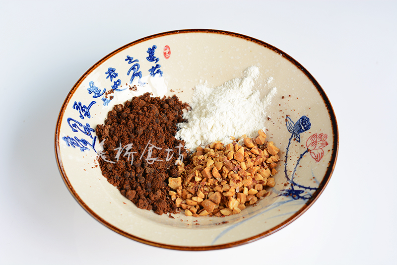 5、花生捣碎,与红糖和面粉一起,拌匀。