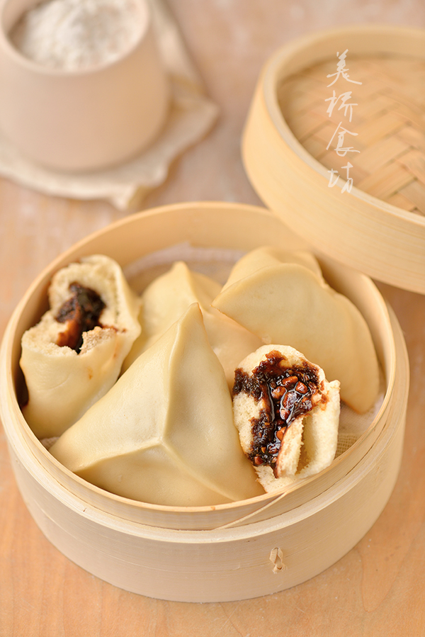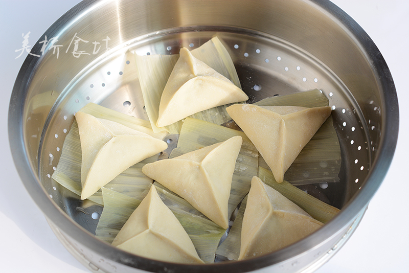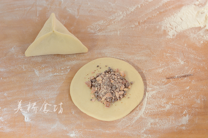 6、将面团分成约50克一个剂子,共6个,擀成圆形,中间放上红糖馅,把边缘用大拇指、食指和中指一起往上收,捏成三角形,边缘要捏紧,以免蒸后开裂。