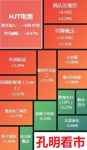 今天早盘受外围影响,三大指数集体高开走高,临午评收盘,股指出现小幅回撤;市场上,HJT电池、酒店及餐饮、煤炭、食品饮料、有色、锂矿、景点及旅游、汽车整车等板块涨幅居前,数字货币、保险及其他等板块飘绿。两市超2600只个股上涨,北向资金半日净买入71.97亿元,短期谨慎冲高回落,午后把握机会逢高减仓应对。