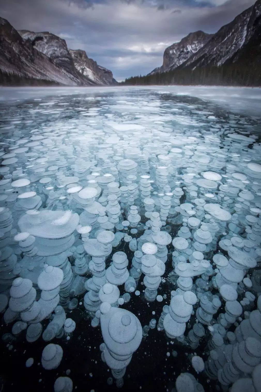 被称为“水之精灵”的Minnewanka Lake其实也能拍到冰气泡的踪迹。在Paul Zizka看来,Minnewanka Lake可能拥有最令他惊喜的冰气泡。因为这里太安静了,似乎是独属于他一个人的气泡湖。事实上,在Minnewanka Lake的湖边也有机会找到冰气泡的踪迹,但若是你经过了20多公里的冰上滑行,再发现一处迷人的气泡湖,那惊喜和满足肯定是完全不同的。