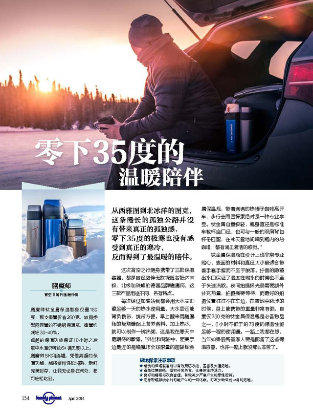 育空公路是北美洲唯一一条可在冬天自驾进入北极圈的公路。2014年3月,《孤独星球》杂志与资深摄影师孙晓岭(老飘飘)合作,终于完成了此次壮举。在这段奇特的旅行中,有无与伦比的美景,有冰天雪地的冻人气候,也有将膳魔师的温暖陪伴。