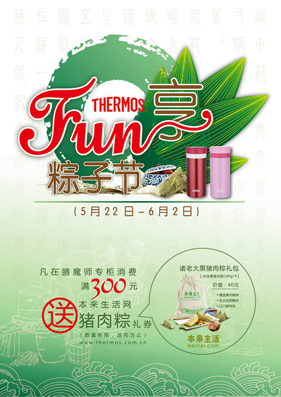 又是一年粽叶香,在端午佳节到来之际,百年保温容器品牌膳魔师携手优质的食品购物平台本来生活同庆端午节,凡5月22日-6月2日活动期间在膳魔师上海24个直营柜点,以及线上5家授权店购买产品满300元,即可获得诸老大黑猪肉粽礼盒(原价40元)优惠券一张(数量有限,送完为止)。