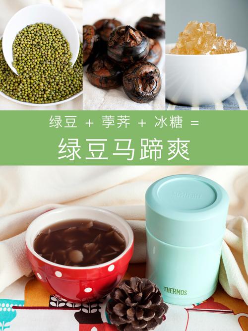 3,荸荠洗净、削皮、切小薄片,撒入煮开花的绿豆汤里,放入冰糖,中小火煮10-15分钟;