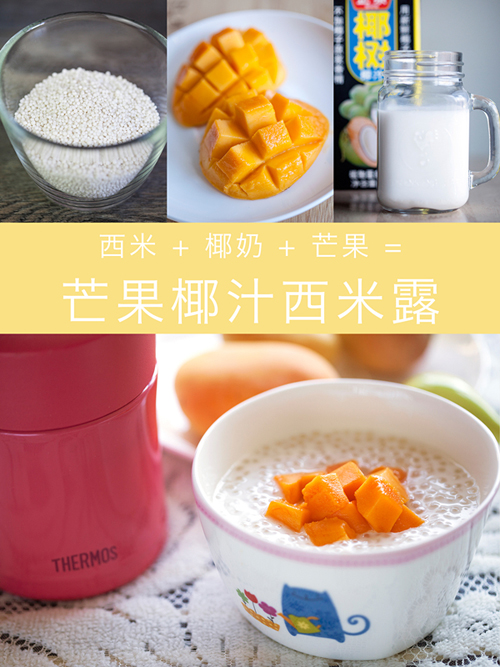 04,倒进适量的冰镇椰奶,放入切成小块的芒果(或其他水果),即可享用。
