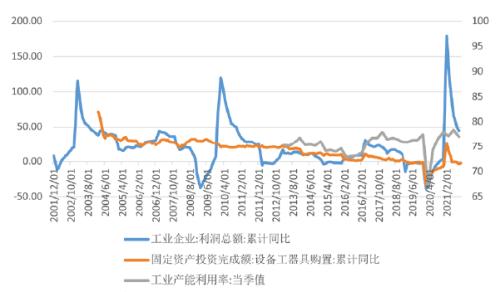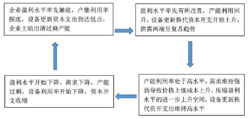 固定资产投资周期以企业购置设备资本开支的变化去解释经济发展周期。企业根据自身盈利水平及对未来的预期,根据设备的技术升级改造又或是设备磨损折旧的情况,有规律地进行设备的更新投资。企业加大投资,将促进经济的发展,经济的发展又反过来促进企业加大投资,直至企业盈利能力开始下降,产能过剩,经济下行。根据固定资产周期的变化可以分为四个阶段(见图4),并可以通过设备投资、产能利用率、企业盈利水平等方面对固定资产投资周期进行观测。