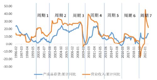 如图2所示,根据产成品存货的变化,自2000年以来我国已经历了6个完整的库存周期,现在正处于第7个库存周期。前6个库存周期的时间跨度平均在40个月左右[1]。本轮库存周期的开始为2019年11月,但受疫情影响,本轮周期的形态和趋势都被一定程度上扭曲。2020年初,全社会的目标以抗疫为先,生产运输等方面受阻,造成需求(以营业收入代表有效需求)短暂休克,存货高企,形成了非典型性的被动补库存。随后随着国内疫情管控有效,生产生活正常化,而国外疫情爆发,生产供给停滞,为应对疫情的货币超发刺激了消费的提前反弹,拉动了我国出口表现强劲。正常化的国内发展叠加出口的拉动,高企的库存被迅速消化,企业营收开始修复,而后进入了主动补库存的阶段。因为2020年初的低基数效应,2021年一季度的营收累计同比增速走出了新高,二季度又显著回落。