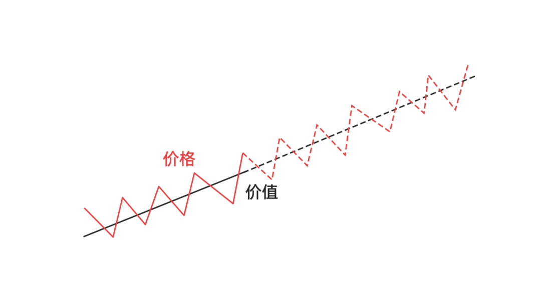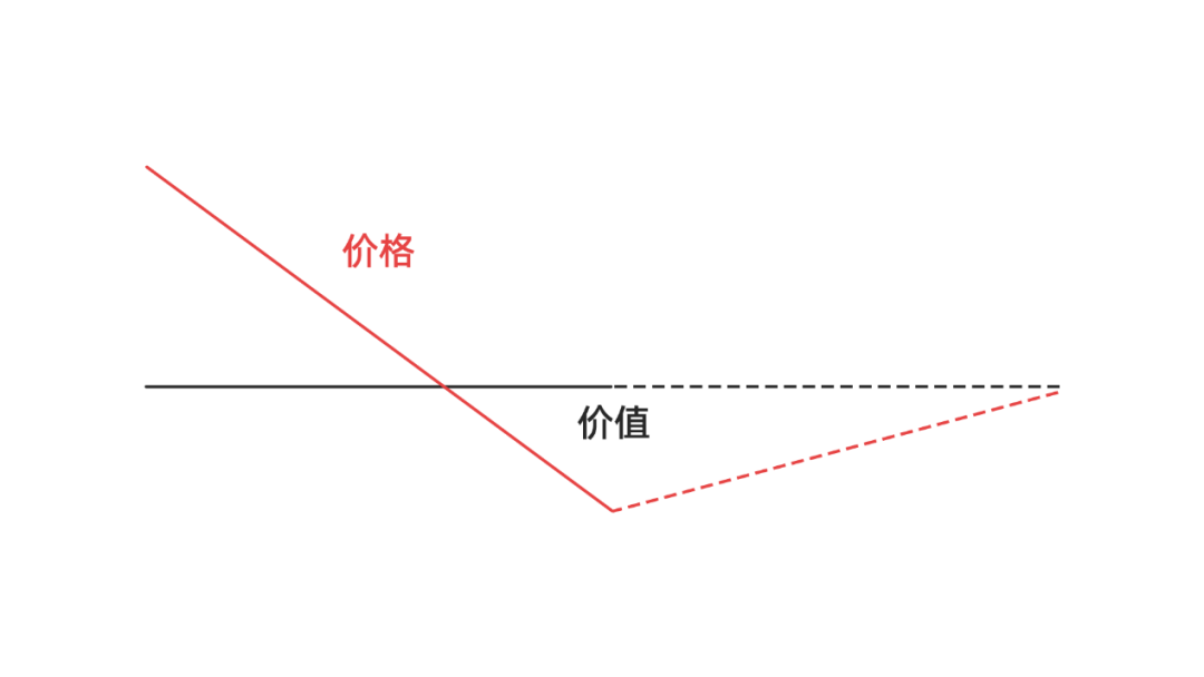 下面我用两幅图描述一下,图中各有两条线,红线代表价格,也就是我们交易时看到的行情价格。黑线代表价值,这是我们看不到的企业内在价值,需要通过经验来评估。关于对价格和价值的理解,可以看前几期的文章《分清价值和价格,投资就没什么难度了》。图中实线代表历史,虚线代表未来。
